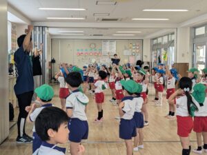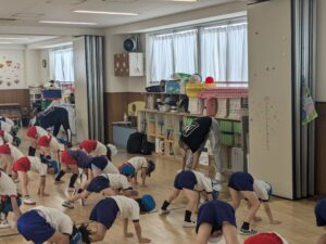 毎年年長組は体操教室の一環として年に3回、ラグダンススタジオのアッ先生を招いてダンス教室を行っています。難しいステップに苦戦していましたが、笑顔がたくさん見られました。