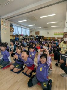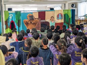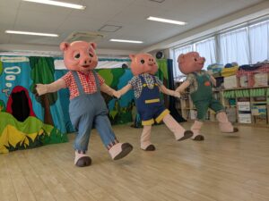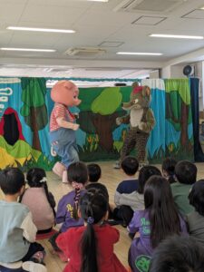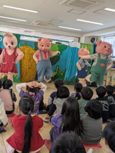本日観劇会を行いました。劇は劇団こぐま座による『着ぐるみ人形劇・三びきのこぶた」です。こぶたとオオカミの掛け合いが楽しくみんな大笑い。お姉さんのコンサートではこぐま座のスーパースター『ゴンちゃん』も登場しておおいに盛り上がり、楽しい1日となりました。